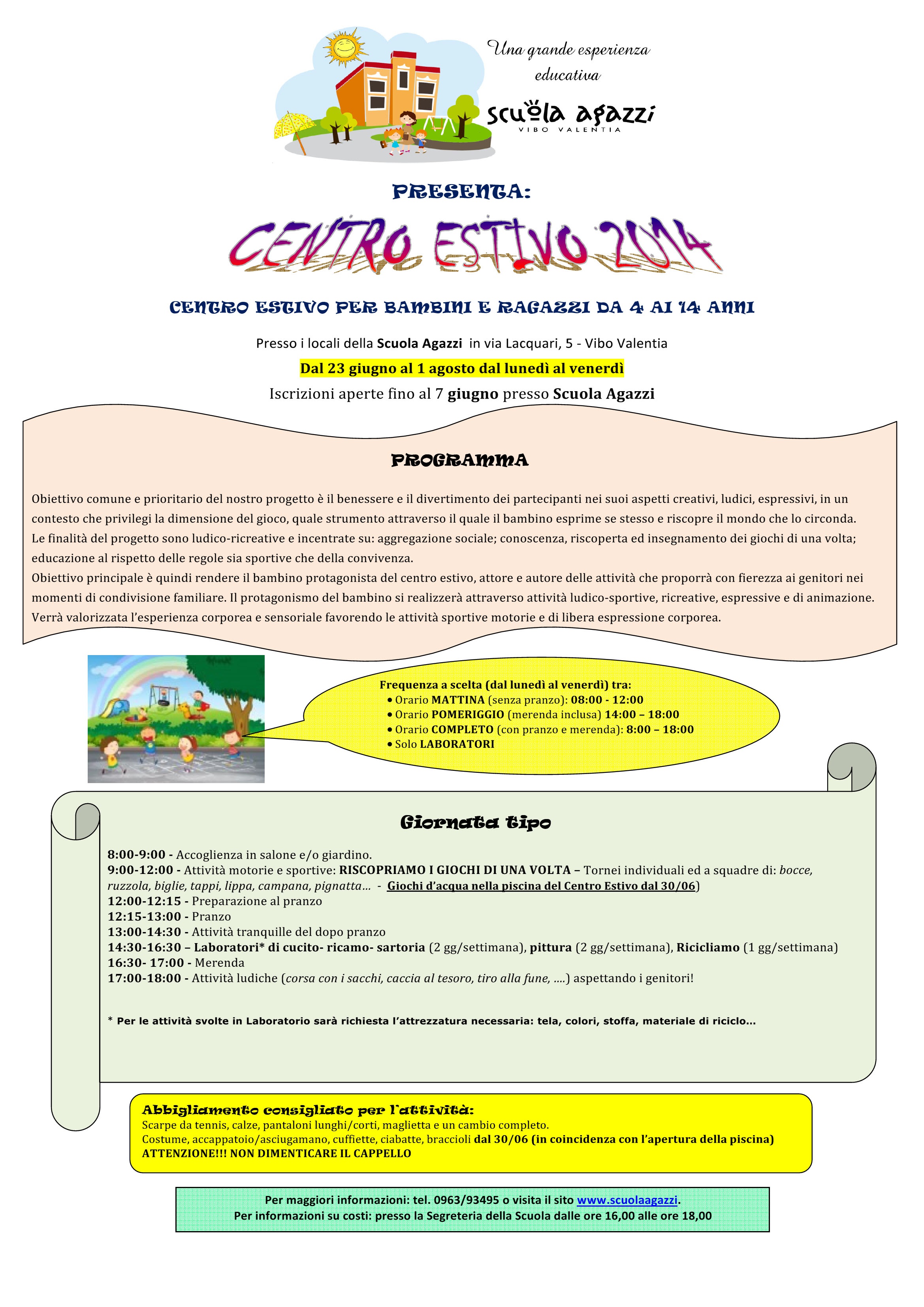 Si svolgerà da lunedì 23 giugno a venerdì 1 agosto, il CENTRO ESTIVO 2014 organizzato dalla Scuola Agazzi per bambini e ragazzi da 4 a 14 anni.