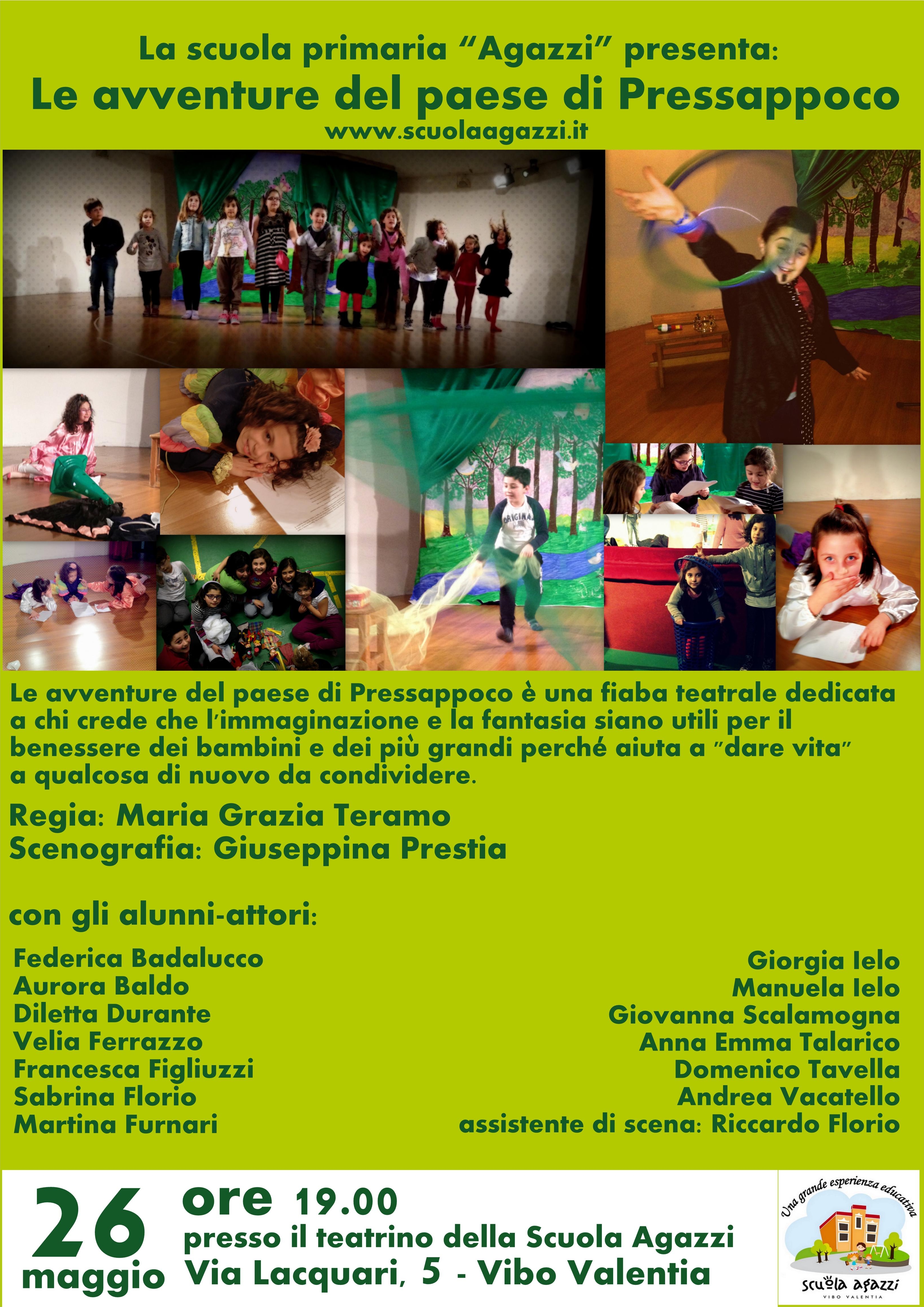 Tra scuola e palcoscenico gli alunni della Scuola Agazzi che hanno frequentato il Laboratorio Teatrale nel corso del presente anno scolastico vi invitano a chiudere gli occhi e riempirli di gioia e sorpresa con: Le avventure del paese di Pressappoco di G. Orselli, una fiaba teatrale dedicata a chi crede che l'immaginazione e la fantasia siano utili per il benessere dei bambini e dei più grandi perchè aiuta a "dare vita" a qualcosa di nuovo da condividere.