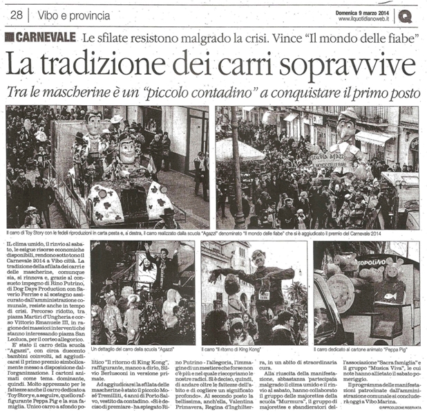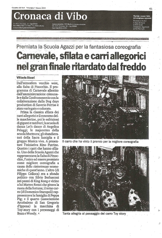 Su tutti i quotidiani locali in edicola oggi domenica 09 marzo 2014, sono stati pubblicati articoli che riportano il grande successo avuto dal carro allestito dallla Scuola Agazzi per il Carnevale 2014 e che aveva come tema "Il mondo delle fiabe".